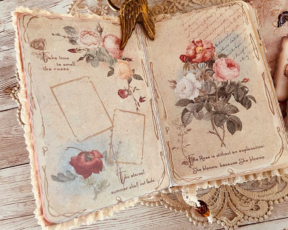There are pages that are collaged with vintage journaling elements, ephemera.